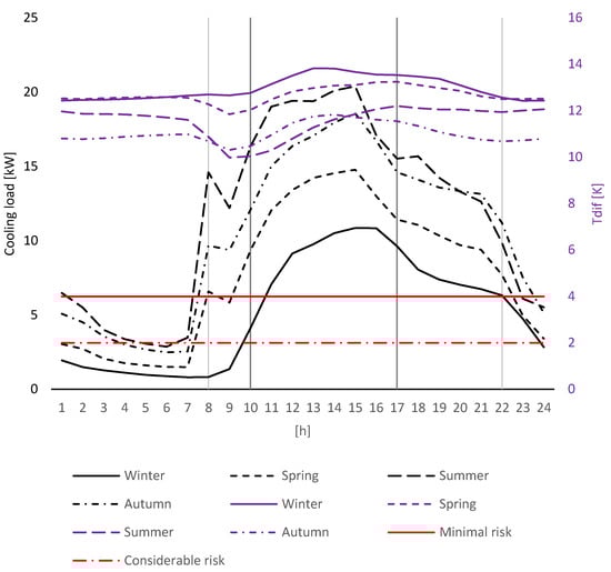 The simulation results for Case (1) (all-air) and Case (2) (air-water) indicated annual electric energy demand for the cooling of 422 kWh/m2·a and 84 kWh/m2·a, respectively. The current practice (Case (1)) assumed setpoint temperatures of 17–19 °C, which demanded high energy. Once setting the setpoint temperatures to 21–26 °C in Case (2) besides other enhancements in the façade setup, a radiant cooling arrangement with a cooling capacity of 58 W/m2 was integrated into Case (2). The primary axis of Figure 9 presents the seasonal daily average cooling load for Case (2), and the secondary axis indicates the resulting Tdif. Substantial savings could be achieved and the annual energy demand of this enhanced model dropped to 92 kWh/m2·a.