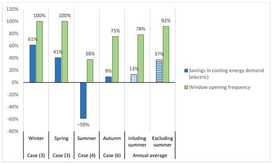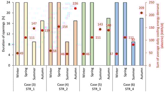 All simulations indicated a maximum RF-WOPot in winter, corresponding to 24 h/davg. A maximum achievable RF-WOPot of 24 h/davg in spring as well can be seen in the four presented Cases. The best conditions that included highest RF-WOPot in summer can be seen in Case (4), where WOT was set at 26 °C and STR_2 was used for Tsup, i.e., 16 °C. Furthermore, Case (4) also provided the best solution in terms of lowest energy demand for cooling. The best case from the same point of view in autumn was Case (6) according to the diagram. It satisfied lowest cooling energy demand per day (209 kWh/d) by highest RF-WOPot (18 h/d). Clearly, the absolute lowest cooling energy demand per day was met by Case (3). However, this case demanded that windows should not be opened at all to reduce the need for the dehumidification of mechanically supplied air to keep the Tdif higher than or equal to 4 K. Therefore, Case (6) demanded slightly higher cooling energy. This is understandable, because more cooling energy for Tsup was required to avoid condensation that might arise owing to the increased window opening duration.