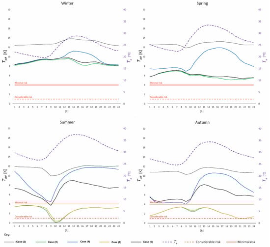 According to Figure 9, a clear distance was maintained between the condensation risk line and the Tdif values in the developed base model, Case (2), in all four seasons. This indicates safe conditions for retrofitting classrooms with radiant cooling panels and mechanical ventilation, with dehumidification and constant Tsup of 16 °C. Achieving the safe conditions was possible in Cases 0–2, in which the windows were continuously closed, eliminating the risk of condensation. Despite the clear energy savings and the supplied fresh air by mechanical ventilation, limited user comfort was provided owing to the lack of window ventilation. Particularly, the operation of natural ventilation was a significant parameter that affected the level of user satisfaction with the space []. The constant Tsup was also energy-intensive, and methods to avoid both limitations are explored in the next sections.