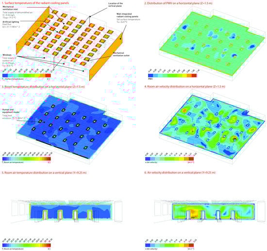 The upper-left image in the simulation results shown in Figure 13 presents the air temperature distribution on a horizontal slice at a 1.5 m height. The diagram to the bottom represents the same data on Slice A-A. The location of the slice is marked on the upper left image. The air velocity distribution can be seen on the horizontal slice (top-right) and the vertical slice (bottom-right). Additionally, the location of the ceiling- and wall-integrated radiant cooling panels were marked on the 3-D images of the simulated classroom. The PMV distribution shown in image number 2 is around +0.3. This result is also in far from the result obtained from the dynamic simulation, which indicated an average PMV of 0.5. The average values are located around the neutral level on the scale of thermal sensation.