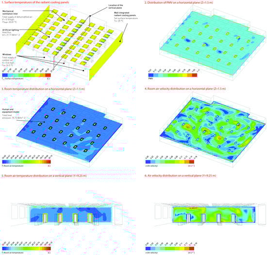Due to the critical conditions in summer and autumn, which are mainly attributed to the elevated relative humidity of outdoor air, the CFD simulation results for both seasons will be depicted in detail. The settings of the water vapor pressure for the PMV calculation included 2383 Pa, and 2412 Pa for summer and autumn respectively. They were calculated from the framework shown in Table 3. The calculation of the mean radiant temperature took place in the CFD software and was obviously affected be the varying surface temperatures of the radiant cooling panels. The set metabolic rate of the 24 occupants was 1.0 met (sedentary work) with which was ca. 58 W/m2 body surface with clothing factor of 0.55 clo according to ASHRAE Fundamentals []. Assuming a body surface area of 1.8 m2, ca. 104 W/person is generated. To consider the heat dissipation by occupants in the CFD analysis, heating panels to represent human models as per the dynamic simulations in IDA-ICE were installed in the room. The 24 human models were distributed in the room evenly following an order of (4 columns × 6 rows). The panels are highlighted in red in Figure 4. Additionally, each of them would be using a computer that generated 75 W. The total generated heat was 3600 W (104 W × 24 persons + 75 W × 24 persons). This means, each occupant generated 150 W.