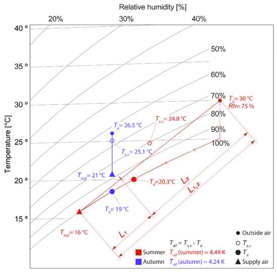 Table 5 outlines the calculation results. During summer, while air was supplied at 16 °C, the location of the air mix indicated a Td of 20.30 °C. This was 4.49 K below the Ts,c of the radiant cooling surfaces. This value corresponds with the results generated by the thermal simulation, which indicated the same Tdif and can be seen in the black curve at 09:00 in Figure 11. Additionally, the Tdif in autumn of 4.24 K was within narrow ranges from the thermal simulation results, which suggested 4.58 K.