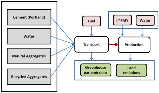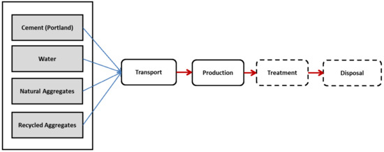 In our research, the production phase (excluding the treatment and disposal phases) constitutes boundaries of the system. The motivation for this choice was our awareness that the production phase is the most relevant phase in terms of environmental impacts, as demonstrated by several authors [59,60,61]. This phase includes the processing of raw materials, transportation, and the production of concrete. Also, the boundaries of the system include the energy required for the processing and transportation of the materials, for the treatment of artificial aggregates (if needed), and also for mixing. In order to properly compare the impacts that result from the different mixtures, the same distances were hypothesized, i.e., (1) 70 km between the concrete mixing plant and the concrete production plant and (2) 20 km from the concrete production plant to the retrieval point for the artificial aggregate. Figure 2 shows the boundaries of the system.