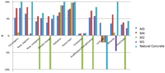 Figure 4 presents a comparison of the impacts of four mixtures of ordinary concrete. The analysis highlighted the fact that ordinary concrete had the greatest impact in all categories. Concrete with a mixture of incinerator ash was slightly better than concrete with aggregate based on murble sludge.