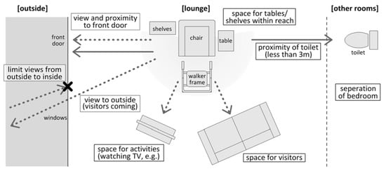 | Control over visitors | Preference for a view to the door from their sitting space | (I) Requirements for the view and proximity to the door | Spatial organization (interior/exterior) Exterior elevation design |