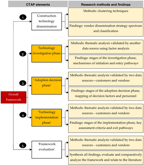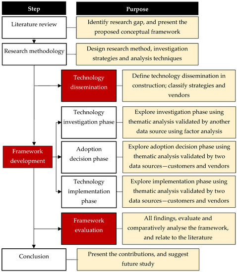 Models of the technology adoption process exist outside construction. However, these are not suitable for the construction industry, as construction is widely recognized as a complex system and distinctly different from other industries [30,31,32,33,34,35]. There is, therefore, a need to investigate the current industry practice of decision making in order to provide a systematic framework to assist industry players in facilitating the process and to hopefully become more successful at utilizing the most appropriate technology in the timeframe available.