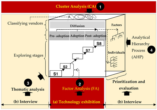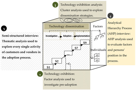 The data from the substantial datasets were collected from semi-structured interviews recruiting both customers and vendors in different regions and then carefully analysed using a specific procedure of the thematic analysis. As the data were collected from different sources using different formats (transcriptions, photos, etc.), several techniques were employed to carefully analyse the data in appropriate ways, each revealing unique aspects of the process and/or cross-validating each other. In Figure 2, the methodological cube was designed to collect data and analyse them in an innovative way from different dimensions of the complex process of technology adoption. The cube illustrates the four techniques that were used to analyse the data: