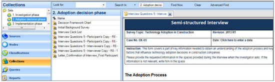 This type of interview is a flexible tool that allows the researcher to generate rich data to advance understanding and consequently develop an empirically- and theoretically-grounded argument about the process [65,93]. However, this type of interview is time consuming both in terms of data gathering and analysis compared to structured interviews. Structured interviews assist the researcher to gather data in a highly structured way. However, they suffer from the disadvantage that they do not allow the investigator to obtain deep understanding of the adoption process, or to explore the cause-and-effect relationship between activities, perspectives and indicators [94]. The problem is that the respondents are forced to choose between alternative choices in structured interviews rather than give their own unique opinion. Thus, the respondent’s replies may not reflect the ‘true’ variation in practices [93]. On the other hand, surveys and structured interviews are easier to conduct and create data that are easy to analyse, and so, they have been used extensively in research of technology adoption in construction (e.g., Alkalbani, Rezgui [95]). Unstructured interviews have the problem that each interview is unique with different content. This prevents the researcher from comparing and contrasting the different interviews, leading to difficulty in generalizing and modelling the phenomena.