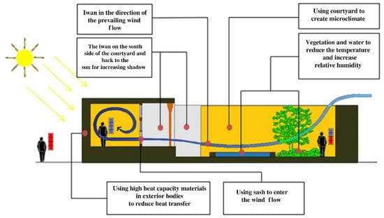 Today, a considerable amount of energy is spent on heating and cooling indoor environments to provide thermal comfort for the building’s residents. The availability of modern heating and cooling systems has led to little attention being paid to passive systems in modern architecture [,]. Greenhouse gas emissions and global warming in recent years, in addition to high energy consumption in residential sectors, have caused the emergence of a greater interest in climatic strategies. Meanwhile, more effort is devoted to using such strategies in local and traditional architecture in modern buildings [,,]. For a long period of time, buildings and climatic strategies have been constructed based on trial and error for local and traditional buildings; however, these experiences are going to be forgotten [,].