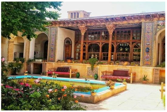 Other climatic strategies to cool indoor spaces in traditional buildings included using the forms of central courtyards, creating a semi-open spaces, and employing porches and balconies [,]. Bright colors are used in these buildings, as well as double and several skin ceilings and domes [,]. Entrance filters and intermediate spaces are applied to preserve the heat or coolness of the indoor space []. In order to increase humidity, ponds and trees were used in hot and dry climate, and wind catchers in several forms were applied to take advantage of wind flow. Also, windows were considered to direct the air from the central courtyard to the upper rooms [,,]. In some buildings, houses have two parts, one for summer settlement and another for winter occupation [], and for each side of the house the central courtyard is devoted to one season []. Orientations of these buildings were usually toward the southeast and a dense pattern of urbanization was commonly used in organizing such buildings [].
