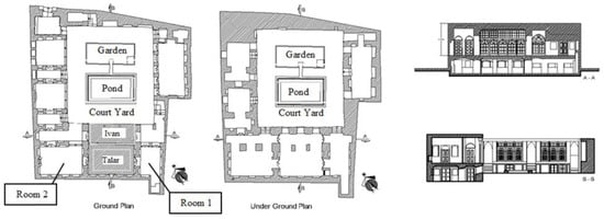 Plans of the underground floor and ground floor of the Manteghi-Nezhad house and the sections of the talar room and iwan.
