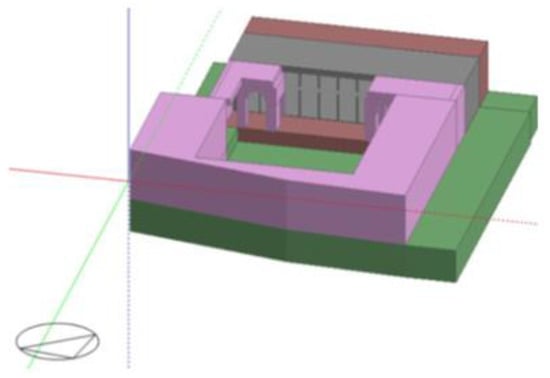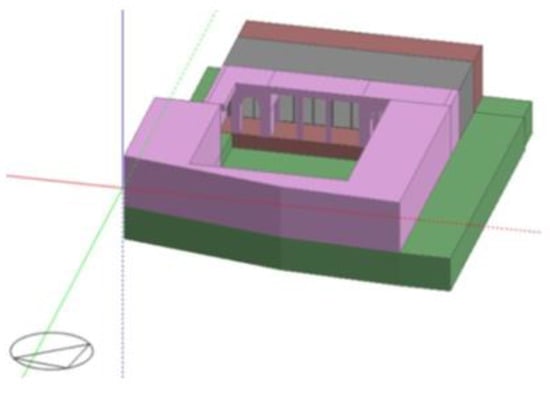 DesignBuilder software [] with the Energy Plus engine was used for the simulation of the Manteghi-Nezhad house. The thermal exchange between the spaces of the building, iwan, talar, and surrounding rooms were simulated. Also, the adjacent buildings which contribute to creating shade were considered as block components and some parts of the neighboring houses and underground spaces below the talar and surrounding rooms were assumed to be adiabatic. Two scenarios were simulated using this software. In the first case, the current situation was simulated according to Figure 6. In the second case, the talar was considered without the iwan, as shown in Figure 7.