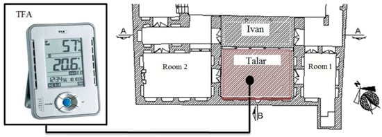For the validation of the DesignBuilder simulation software, information related to temperature and relative humidity were collected from 9:00 a.m. on 24 January 2017 to 9:00 a.m. on 2 February 2017 (10 days). This period included the coldest days during 2017 according the meteorological organization of Iran. The interval time for the data collection was 20 min. The location of the data logger is shown in Figure 8. The measurement was taken in the center of the talar room and the data logger’s height was 0.8 m.