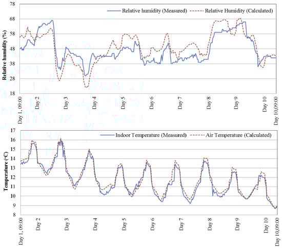 Comparison of the measured temperature, relative humidity and calculated temperature, relative humidity for the central talar room (24 January 09:00 a.m. to 2 February 09:00 a.m., 2017).