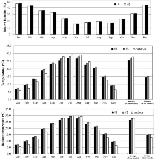 Mean radiant temperature was calculated in assessment of thermal comfort, which is the relationship between the radiant and room surfaces (floor, ceiling and walls) []. The two factors of relative humidity and air temperature have a great effect on an individual’s thermal comfort. A relative humidity less than 30% may result in dry skin, eye irritation, and breathing problems, while a relative humidity (RH) higher than 60% may result in an environment suitable for mold growth and allergic problems [].