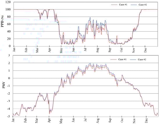 Comparison of PMV and PPD of the talar room for cases 1 and 2 during the warm months.