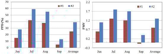 After the analysis of air temperature, mean radiant temperature (MRT) wind speed, and relative humidity, the value of the PMV and PPD were calculated according Equations (1) and (2), as represented in Figure 11. The metabolic rate for calculated PMV and PPD was assumed to be 0.9. The metabolic rate is the average of light working, seating, relaxing, sleeping, and reclining according to ISO 7730 []. Also, the clothing level was assumed to be 0.5 according to ISO 7730 [] for typical summer indoor clothing.