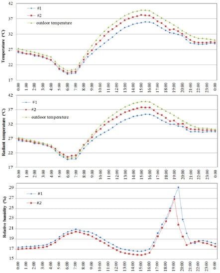 In order to analyze the indoor air temperature, relative humidity, and radiant air temperature in detail, a representative day during the hot months was selected. According to Figure 13, the selected variables were compared for case 1 and case 2 to find out the overall thermal conditions that the iwan can provide inside the talar room. The results of indoor air temperature and radiant air temperature showed that the iwan could significantly affect the overall indoor conditions in case 1. The difference between the indoor air temperature and the outdoor air temperature in the afternoon was measured as the highest value for the talar with the iwan. The indoor air temperature at 4:00 p.m. was 36 °C while the outdoor air temperature was more than 41 °C. The difference for radiant air temperature was higher than the indoor air temperature, where it rose up to 6 °C at 4:00 p.m. This was due to the shadow caused by the iwan projection at the southern direction of house. Comparison of the results during the nighttime and the early morning showed a small difference between the indoor and outdoor air temperatures in both cases. This was due to the absence of sun radiation. Even the difference of air temperature between cases 1 and 2 was less than 1 °C. This shows that the iwan could effectively reduce the air temperature as well as the radiant air temperature during the morning and the afternoon times.