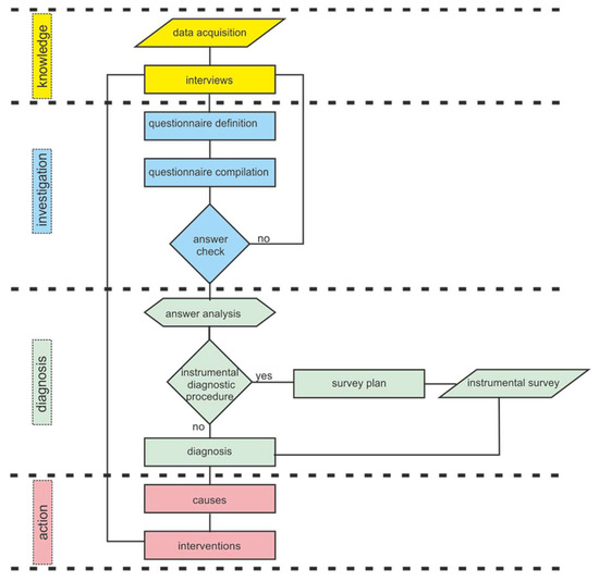 Once the knowledge procedure is completed, it is possible to start the next phase of the method, which consists in the analysis of the judgements on the performance of the building system and of the built environment. In this phase, the weaknesses emerged during the phase of investigation are highlighted. In particular, starting from the judgements expressed by the users and from direct observations, the elements of the built environment, which show a negative performance judgement and on which it is necessary to intervene to improve their performance efficiency, are pointed out. After finding weaknesses, it is necessary to conduct in-depth investigations by means of objective methods and instrumental diagnostic procedures that guarantee a precise and direct identification of their causes. Finally, based on the instrumental analyses and on the knowledge of the causes of the weaknesses detected, the last phase includes the design and the implementation of the most suitable interventions and technical solutions. Building interventions must address and solve problems with sustainable solutions. However, the assessment process does not finish in this phase, since, to pursue productive excellence, it should be reiterated periodically to monitor and maintain the high performance standards of the built environment.