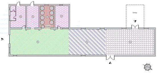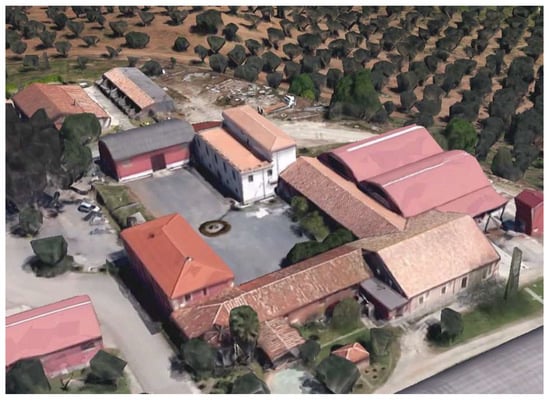 The proposed model was applied to an olive oil mill that typically represents the productive situation in Calabria. The building is in Lametia Terme, a town in the province of Catanzaro (38°55′20.593″ N 16°19′27.082″ E). It is part of a larger historic rural building complex (Figure 2), which presumably dates to 1780 and is one of the best preserved rural complexes in Calabria. The olive oil mill, which is still situated in the original building, has a modern continuous milling system. The extra-virgin olive oil it produces is extracted from olives of the Carolea cultivar, which are exclusively grown in the company’s olive grove and assure an annual production of some 50,000 L. Milling starts in the early weeks of October and continues until March, while the produced extra-virgin olive oil is kept in stainless steel tanks, placed in a special area of the mill, and then bottled during the year, according to the market demand. With a view to assuring the excellence of the production, the whole production process is carefully checked by a quality manager and by a technical supervisor. Moreover, around 15 employees take part in the processing cycle with different tasks.