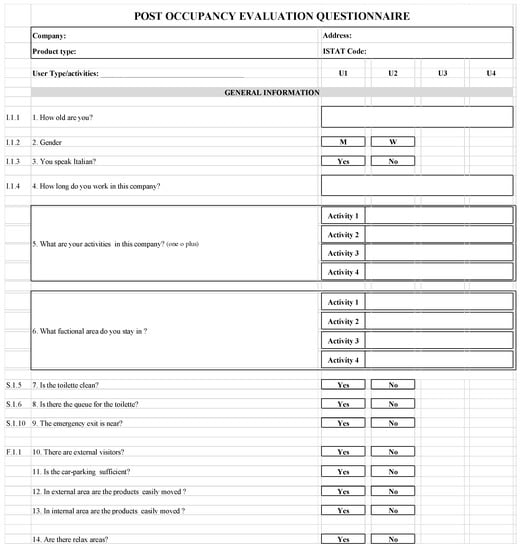 The questionnaire was targeted to each category of users of the building: process operators (U1), quality managers (U2), sanitation operators (U3), and visitors (U4) (Figure 3).