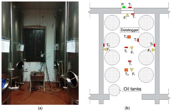 Installed instrumental network. (a) oil storage area (b) network lay-out showing the type of thermal sensors installed and their position.