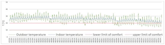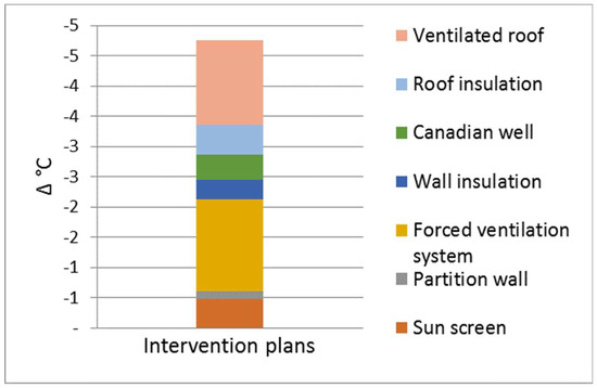 A few minor sustainable insulation interventions were proposed, such as the installation of a sun screen on the external wall exposed to the south-west; the separation of the storage area from the processing area by means of an internal mobile partition wall [22]; an automatic forced ventilation system with a 7 vol/h air renewal; the thermal insulation of the walls of the storage area with 7 cm-thick agglomerate cork boards (λ = 0.04 W·m−1·K−1) [23,24]; a better insulation and ventilation of the roof; and the construction of a Canadian well, i.e., a geothermal system that uses the energy present in the ground, just beneath the Earth’s surface, to heat or cool ventilation air inside the buildings [25]. The results of the thermal analysis of the building, carried out with the software program, demonstrated the effectiveness of each intervention. Consequently, the indoor thermal values obtained with the dynamic thermal simulation showed a clear improvement in the building behavior in terms of protection from high temperatures, about 4.5 °C lower than the current condition (Figure 9).