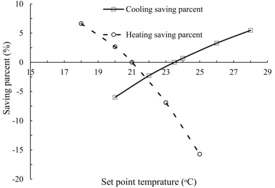 Figure 4, a maximum saving of 5% was achieved for a temperature of 28 °C. On the other hand, up to 6.6% saving could be achieved for a 18 °C heating set point. The baseline set point temperature is defined when the curve intersects with the