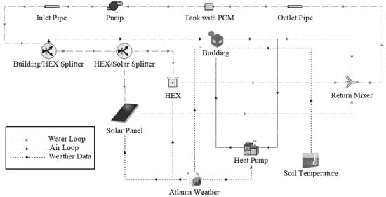This water loop for this system comprised a hydraulic pump, water tank, heat exchanger (HEX), solar panel, valves, and copper pipes embedded in the walls and ceiling of the building. Figure 2 shows the TRNSYS schematic for the ITC/TSM model.