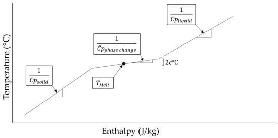 where   Cp solid is the specific heat for the solid PCM with units of J/kg K, Cp liquid is the specific heat of the liquid PCM with units of J/kg K, LHF is the latent heat of fusion with units of J/kg, and ϵ is the small temperature interval over which phase change occurs with units of K. Selection of the temperature interval ϵ is discussed by Voller [28]. A graphical representation of the specific heat’s relationship to temperature and enthalpy is shown in Figure 3.