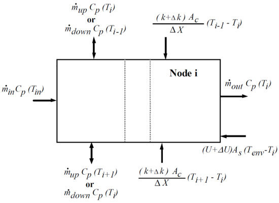 where, Δ x i + 1 i is the center-to-center distance between node i and the node below it (i + 1) in m,   Δ x i 1 i is the center-to-center distance between node i and the node above it (i − 1) in m, k is the thermal conductivity of water with units of W/mK, U tan k is the loss coefficient (per unit area) of the tank with units of W/m2 K,   A s ( i ) is the surface area of node i in m2,   T env is the environment temperature in K, m ˙ down and m ˙ up are the bulk fluid flowrate down/up the tank in kg/s, and m in and m ˙ out are the mass flowrate entering at the inlet and leaving at the outlet in kg/s.