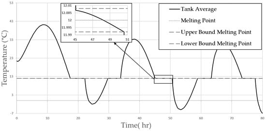 To verify that the specific heat modifications were working correctly, the tank was isolated with only a sinusoidal temperature input and constant flowrate. Figure 5 shows the average tank temperature, the PCM melting temperature, and the upper and lower bounds for phase chase. It can easily be seen how the temperature slowly decreased over 0.016 °C (ϵ = 0.008 °C) during phase change. This simplified mode is only shown for verification that the tank specific heat piecewise equation (i.e., Equation (1)) was operating as intended.