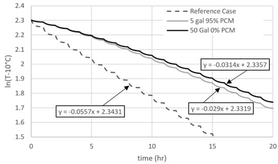 The inverse of the slope of Equation (7) yields the dominant time constant for the building. For each case, the building’s free response was found, and ln ( T Building C ) was plotted versus time. These slopes and their respective linear trendline equations can be seen in Figure 6.
