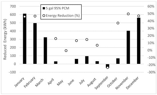 Figure 8 shows the monthly percent reduction in energy required by the heat pump. Energy reduction is not consistent, with an average heating reduction of 48% and an average cooling reduction of 3%. The month of May has no significant benefits, and September has moderate losses (24%). However, these losses are offset by the considerable savings found between November–March. The results indicate that it is possible that the valve operating conditions and the PCM parameters are more beneficial for cold months. Using different PCM and adjusting operating regimens for a specific season could show an increase in benefits. Specifically, water circulation currently operates on a monthly schedule when switching between the HEX and the solar panel for temperature regulation. More benefits could be found, or the losses in September could be reduced if a semi-predictive method was used on a weekly basis instead of using historical averages on a monthly basis. Although a 24% increase in consumption for September sounds significant, it is only 46 kWh, and is around 2% of the total required energy for the reference model during the cooling months. These new operating conditions could likely benefit other transitional months, as mild temperatures showed the least benefits from the system. Again, it must be noted that these mild months consume the least amount of energy. The overall yearly savings of the ITC/TSM model was about 35%, and the ITC/TSM with the PCM model was about 35.2%.