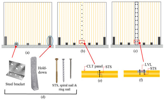 Platform-type construction, where each floor acts as a platform for the floor above, is the most common structural system used for low to mid-rise CLT buildings []. CLT shear walls, both single and/or coupled walls (Figure 1a–c), are commonly connected to the foundation or a concrete podium by steel brackets and hold-downs using metal fasteners like screws and nails (Figure 1d), while CLT walls and floors in the upper storeys are connected by brackets and hold-downs (HD) or by STS. The panels in between floors and walls are connected by screws using either lap or spline joints (Figure 1e–f). “Designing and building CLT structures, also in earthquake-prone regions is no longer a domain for early adopters, but is becoming a part of regular timber engineering practice” [].