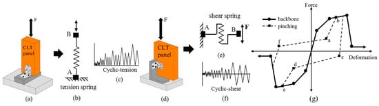 CLT connections loaded in tension and shear (Figure 2a,d, respectively) were modelled in OpenSees [] using zero-length spring elements as shown in Figure 2b,e and were defined by two nodes at the same location, where the nodes are connected by the uniaxial material model “Pinching4” [] to represent the force-deformation relationship for the element. Pinching4 (Figure 2g) is a piecewise linear model with a “pinched” load-deformation response that accounts for strength and stiffness degradation under seismic loading []. The model accounted for the cyclic strength degradation between different cycles, as observed in the experimental tests. The model includes 16 parameters to define the backbone curve and unload-reload paths along with pinching behaviour. The least-square method was employed to estimate the parameters of the Pinching4 model from the backbone of the tested connections. The parameters were calculated based on the response of the forces at corresponding displacements from the backbone curve using equivalent energy elastic plastic (EEEP) curves according to ASTM E2126 []. An EEEP curve is a perfectly elastic plastic representation of the actual response of the specimen, which encompasses the same area of the experimental backbone curve from the origin to the ultimate displacement.