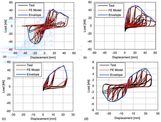 The FEA models of connections were calibrated using the test results presented by Gavric et al. [,] and Schneider et al. []. Figure 4a,b show the hysteresis of bracket B1 under shear and tension, respectively, Figure 4c shows the hysteresis of hold-down HD1 under tension, and Figure 4d shows the hysteresis of STS half-lap joint WW1 under shear. The Pinching4 model accurately captured the load-deformation hysteresis behaviour, including the backbone curves of CLT connections, with the hysteresis loops showing that the FEA line up with the test results in most of the cycles. However, in some cycles, the test results show irregular drops or changes in slope as a result of sudden fastener failures or formation of cracks and wood failure that was not captured by the FEA models.