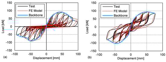The calibrated connection models were incorporated into the FEA models of the CLT shear walls and the wall models were analyzed using the loading protocols followed in the full-scale tests of Popovski et al. [] and Gavric et al. []. Similar to these tests, reverse cyclic displacements were applied in the top nodes of the FEA wall models, and the resulting force was measured in each cycle at the bottom of the wall support. The load-displacement graphs from the tests and FEA models were plotted together, and the accuracy of the FEA models was compared and validated against the CLT shear wall test results as presented in Figure 5. The hysteresis loops along with their backbone curves indicate a strong agreement between tests and FEA.