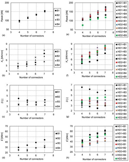 The results from the parametric study on single walls, illustrated in Figure 6, demonstrate that the capacity, stiffness and energy dissipation increase with an increase in the number of connectors. By increasing the connectors from four to seven, the average strength, stiffness and energy dissipation in single shear walls with brackets increased by 57%, 39%, and 30%, respectively (Figure 6a,b,d). Similarly, the increase in average strength, stiffness and energy dissipation in the shear walls with brackets and hold-downs was 53%, 33%, and 39%, respectively (Figure 6e,f,h). While the increase in strength in single shear walls was found to be linear with the increase in the number of connectors, the increase in stiffness and energy dissipation did not follow a linear trend. However, placing the HDs on the corner of the single walls increased the seismic performance significantly (i.e., the increase in stiffness and energy dissipation was found to be 49% and 23%, respectively). There was no clear trend observed in the change in ductility in the shear walls, however, the walls with HDs showed higher ductility compared to walls with brackets only (i.e., 7% higher ductility).