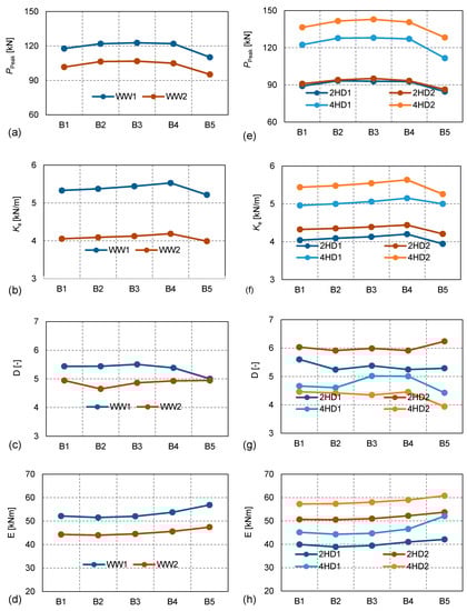 Single walls with brackets: (a) capacity, (b) stiffness, (c) ductility, and (d) energy. Single walls with brackets and HDs: (e) capacity, (f) stiffness, (g) ductility, and (h) energy.