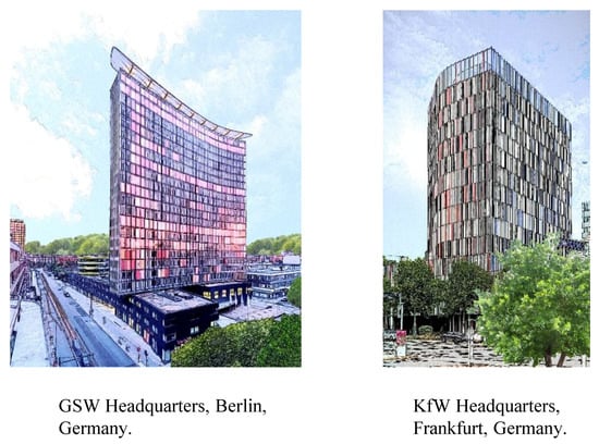 The GSW (Gemeinnützige Siedlungs—und Wohnungsbaugesellschaft mBH), which translates to the Charitable Settlement and Housing Association Ltd., is located about 250 m (820 ft) from the former Berlin Wall and the historical site of Checkpoint Charlie, occupying a sensitive place in the urban cultural fabric of the city. Berlin-based Sauerbruch Hutton Architects designed the GSW tower. The firm is renowned for creating functional and sensual architecture achieved using dynamic colors and fluid curvilinear forms. Completed in 1999, the 22-story, 85 m (250 ft)-high GSW tower is an exemplar of ecological architecture—often referred to as “Germany’s first ecological high-rise”—for integrating numerous sustainable features that facilitate natural ventilation (stack and cross ventilation) and daylighting. Some of the strategies employed include a narrow floor plate, automatically and manually operated windows, sun screening, blinds, thermal storage, stack heating, and a double-skin thermal flue on the west facade. The layout of existing buildings on the site forces an undesirable east–west orientation to the tower. In response, the architects designed the west facade as a double-skin system with a thermal flue, which provides automatic and manually operated triple-glazed windows on the inner skin. The outer skin contains fixed single-glazed panels that consist of 3.3 m, 1.8 m, and 10 mm (11 ft, 6 ft, 0.4 in) glass panes. The inner skin consists of Low-E double-glazing. The interstitial space of 0.9 m (3 ft) contains shading devices, a series of vertically pivoting and sliding louvers, which shut out the unwanted light of the harsh afternoon sun [16]. The louvers are made of 0.6 m (2 ft)-wide and 2.9 m (9.5 ft)-high aluminum panels and are colored red, pink, and orange. These rich colors along with the building’s flying roof sculpture make the GSW Headquarters an instantly recognizable building (Figure 3).