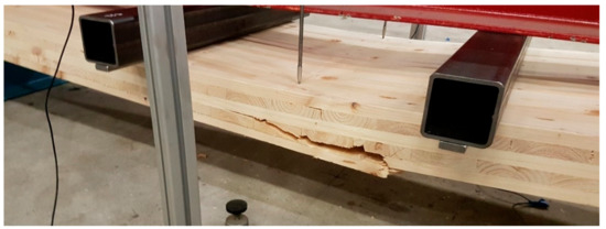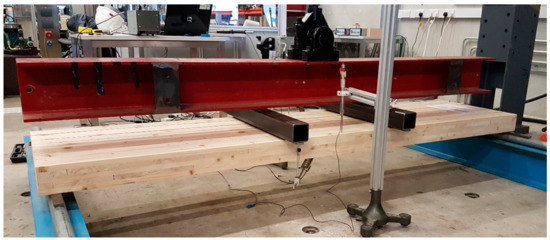 The experimental testing of the strength and stiffness properties of the CLT panels was in accordance with EN 16351 [1]. This standard specifies four-point bending tests over spans of 24–30 times the thickness for the bending strength and stiffness determination, and 12 times the thickness for the (rolling) shear strength determination perpendicular to the plane. The distance between the load points was equal to six times the panel thickness for all of the test configurations. The CLT panels were simply supported, as seen in Figure 1. A load was applied across the whole width of the CLT specimens using steel spreader beams and plates of a width, not greater than half of the panel thickness. The load was applied at a constant rate of displacement, adjusted so that the maximum load was reached within 300 ± 120 s. The bending test set-up for one five-layer panel over a test span of 2400 mm can be seen in Figure 1.