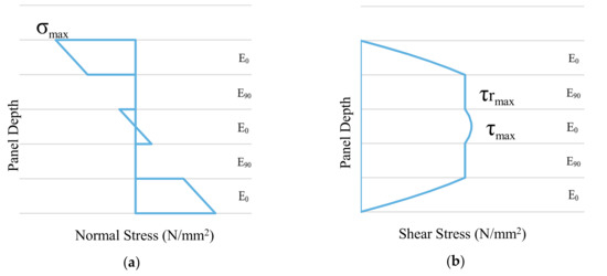 CLT element loaded out of plane. (a) Normal stress distribution through a five-layer panel assuming E90 = 0 N/mm2; (b) shear stress distribution assuming E90 = 0 N/mm2.