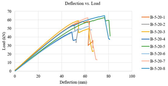 The total deflection to the failure of each panel was recorded using the mean measurement from two LVDT’s located at the mid-span on each side of the panel. The deflection to failure from the bending tests on the five-layer panels (configuration B-5-20) can be seen in Figure 4. The maximum moment has been calculated for each test and the analytical models previously mentioned have been used to determine the theoretical maximum bending strength.