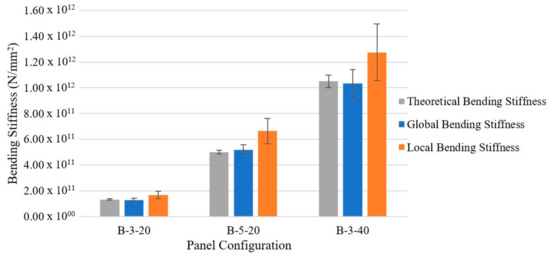 - The global bending stiffness results are in good agreement with the theoretical bending stiffness results, regardless of the panel thickness or lay-up studied.