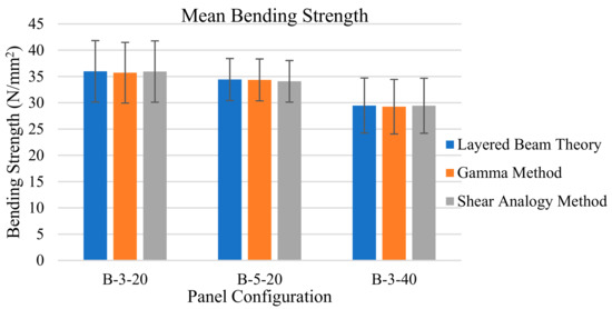 The mean bending strength results of the 60 mm B-3-20 panel configuration from the layered beam theory, gamma method, and shear analogy method are 35.98 N/mm2, 35.71 N/mm2, and 35.93 N/mm2, respectively. These values are similar to one another with the almost identical results from the layered beam theory and the shear analogy method, and a slightly reduced value for the gamma method. The comparative values for the 100 mm B-5-20 configuration are slightly reduced with bending strength values of 34.43 N/mm2, 34.35 N/mm2, and 34.08 N/mm2, respectively, and the 120 mm B-3-40 panel configuration values are further reduced with bending strength values of 29.47 N/mm2, 29.25 N/mm2, and 29.43 N/mm2, respectively, from the layered beam theory, gamma method, and shear analogy method.