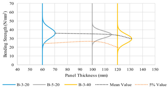 The influence of the number of layers can also be seen to have an effect when examining the mean and standard deviation associated with the five-layer panels (B-5-20). There is a reduced scatter of the results associated with this panel configuration, when compared to the three-layer panels. This is due to the increased number of layers and the homogenising effect or laminating effect, whereby defects such as knots, seasoning checks, reaction wood, and sloping grain, which may be crucial in the performance of a solid timber piece, are generally limited to one board in a CLT panel, greatly reducing the effect on the structural integrity of the panel. The statistical distribution of the bending strength results (layered beam theory) for each panel configuration are presented in Figure 7, and the influence of panel thickness can be seen. The lines representing the mean and characteristic fifth percentile values are also presented, in order to examine the differences due to the panel configurations.