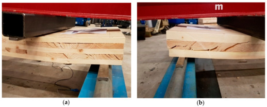 Rolling shear failure: (a) five-layer panel (S-5-20-5) and (b) three-layer panel (S-3-40-7).