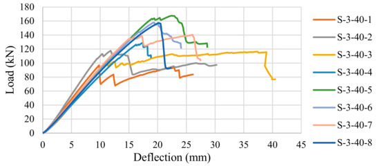 The shear test results for all of the panel configurations are presented. Each panel failed in the rolling shear as expected, with the exception of panel S-5-20-1, which delaminated prior to shear failure. The shear and rolling shear test failure behaviour in a five-layer panel (S-5-20-5) and a three-layer panel (S-3-40-7) can be seen Figure 8a,b, respectively. The failure mechanism can be seen in the transverse layers of both of the panel types. The load-deflection response of the three-layer panels (configuration S-3-40) can be seen in Figure 9. The maximum moment has been calculated for each test specimen and the analytical models have been used to determine the theoretical maximum shear and maximum rolling shear stress.