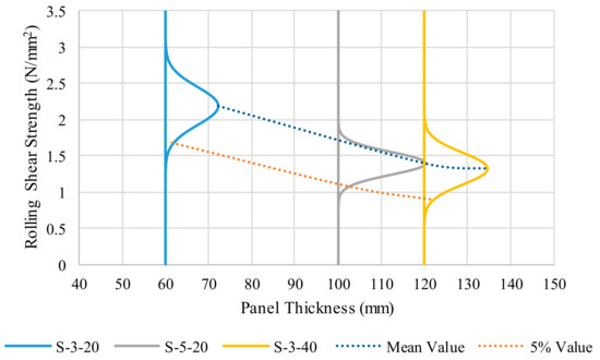 The established mean values of rolling shear strength are in agreement with the study by Blaß and Görlacher [23], where rolling shear results ranged from 1.2 N/mm2 to 2.1 N/mm2, and a characteristic value of 1.0 N/mm2 for the rolling shear strength of European spruce was proposed. The mean characteristic rolling shear values of the tests were found to range from 0.88 N/mm2 to 1.69 N/mm2. The lowest values were observed in the thickest panel configuration, S-3-40. The boards used in this panel configuration had board width-to-thickness ratios less than four. The two most common design recommended values for such layers are 0.7 N/mm2, prescribed by EN 16351 [1], and 0.8 N/mm2, prescribed by Brandner et al. [3]. In Figure 10, the influence of the panel thickness and number of layers on the rolling shear strength distribution can be seen. When examining the rolling shear strength distribution, there is a decrease in the mean and characteristic shear strength with the increasing panel thickness. The variability in the distribution of the rolling shear strength for the five-layer configuration is seen to be less than either of the three-layer configurations.
